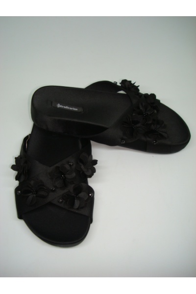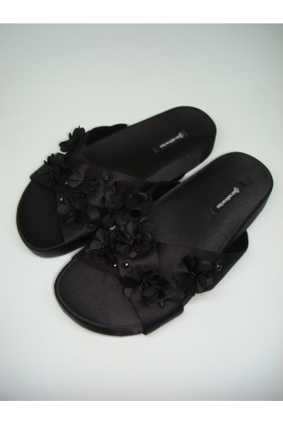 Шикарные атласные женские шлепанцы от известного испанского бренда Страдивариус. Легкие и удобные!! Универсальный черный цвет!! Украшены тканевыми цветочками и камешками!! Отличное качество!!