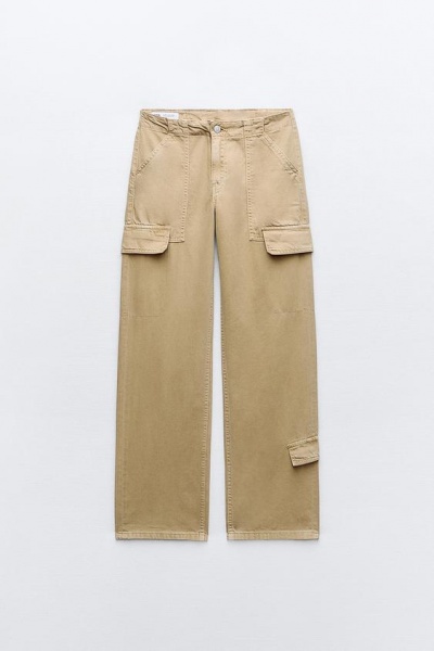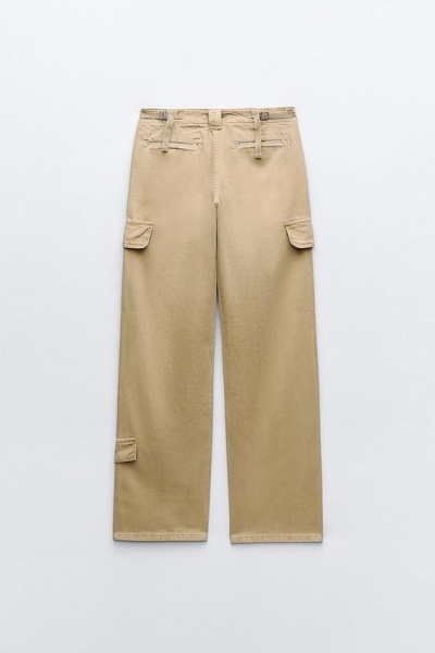 Стильні жіночі штани від відомого іспанського бренду Zara. Трендовий бежевий колір. Середня посадка. Дві накладні кишені попереду, дві скриті кишені позаду. Оригінальний візуальний карманчик по низу штанини. Талія регулюється позаду двома резинками. Металевий гудзик з фірмовим лого Zara. Приємна нещільна тканина.