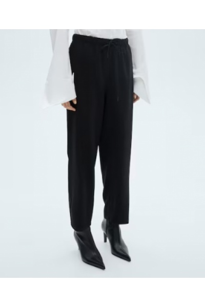 Стильні жіночі штани від популярного іспанського бренду Mango. Універсальний чорний колір. Вільний крій. Талія на широкій еластичній резинці, регулюється шнурком. Дві бокові кишені.